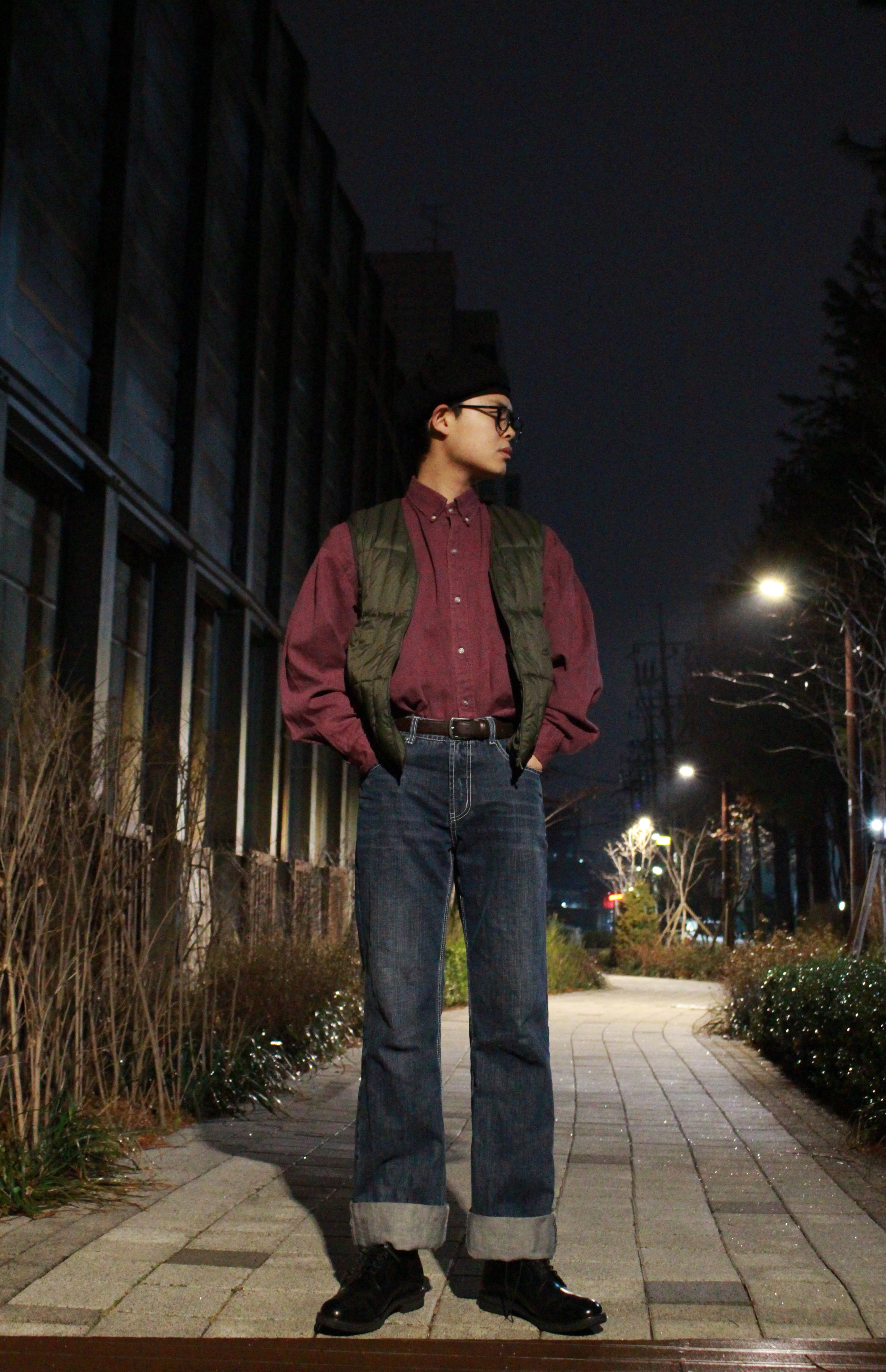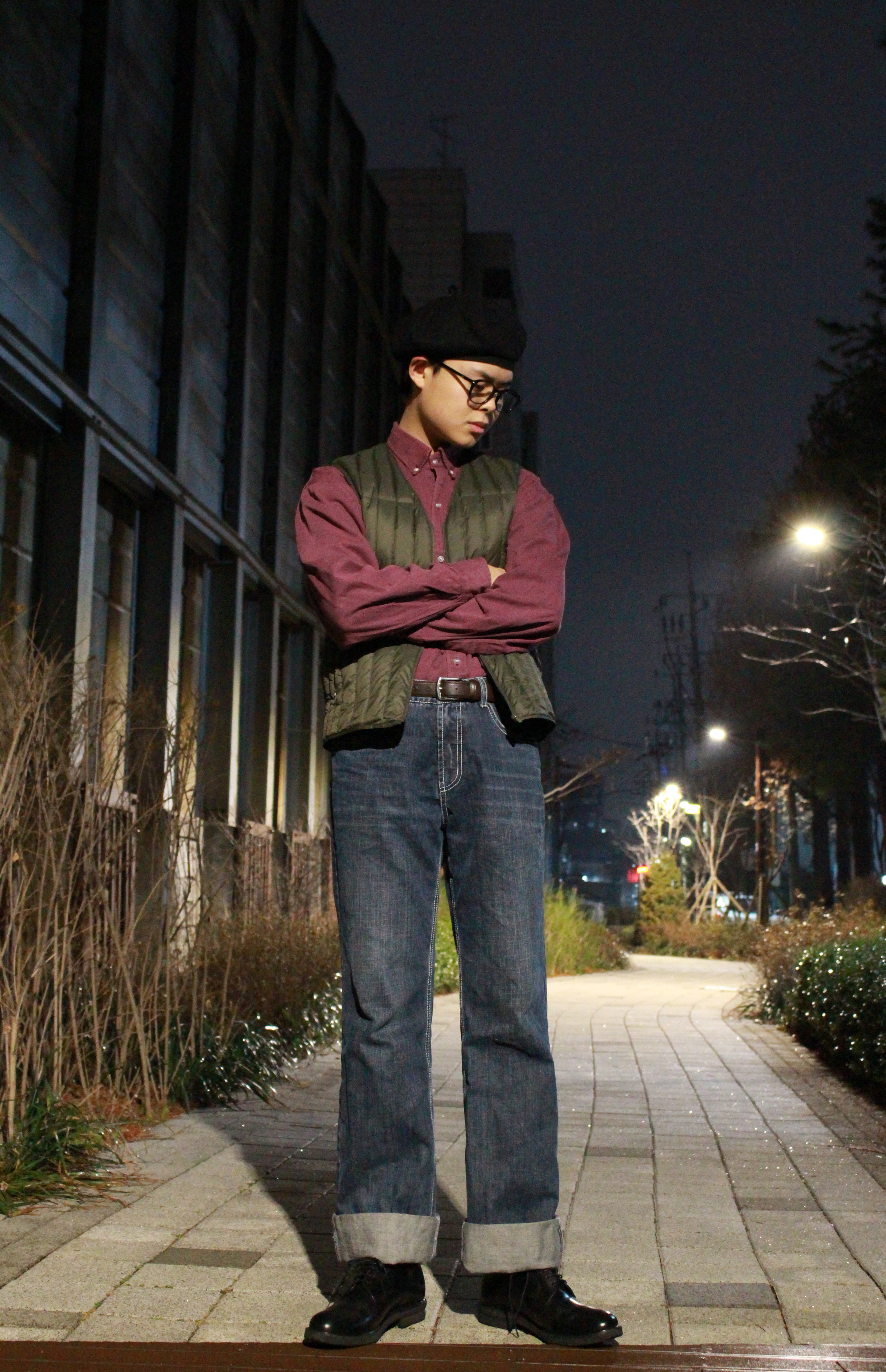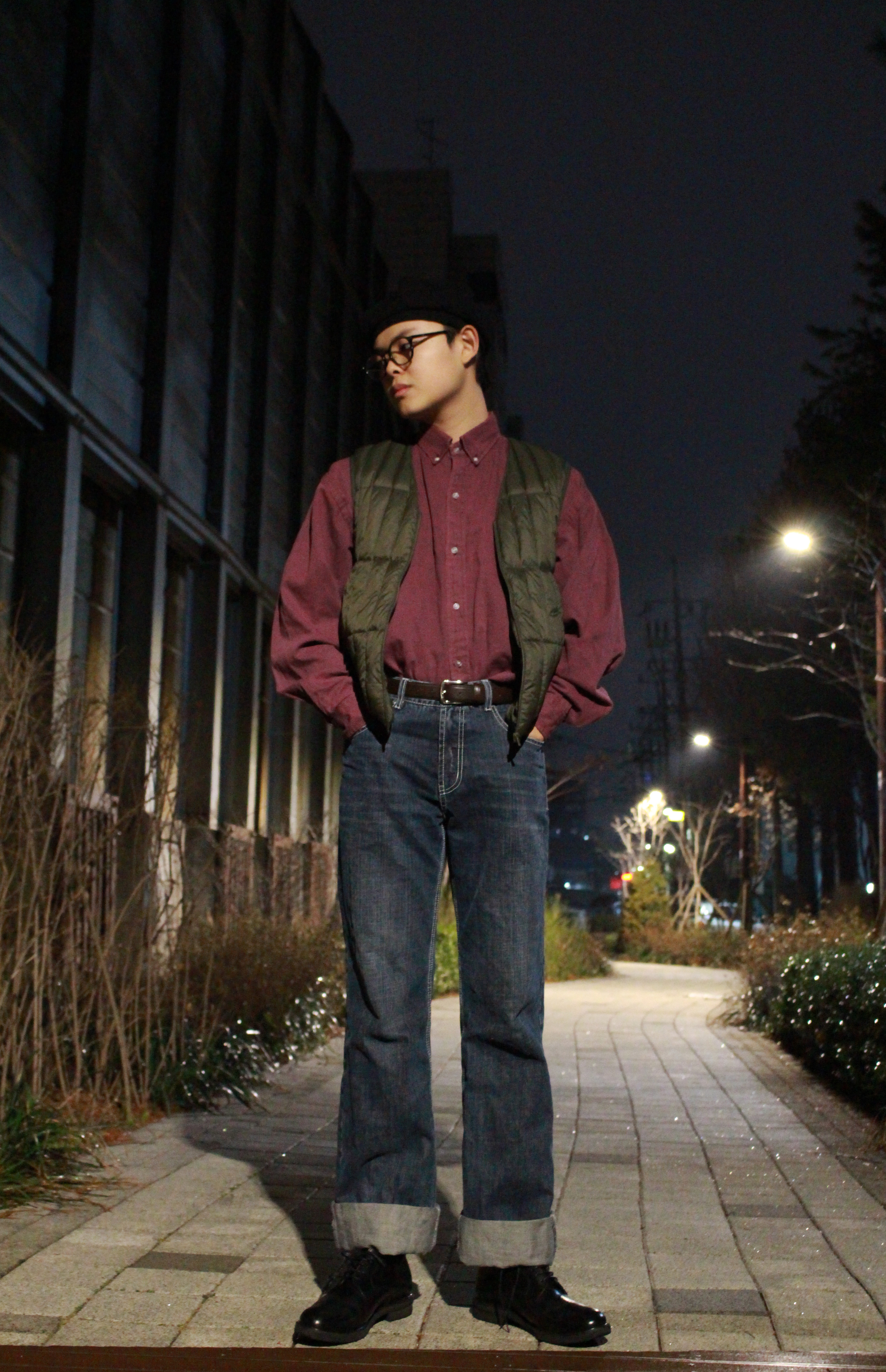 바로 이 사진 입니다~ 오랜만에 빈티지한 느낌의 옷을 입어 보았어요. 평소에는 그냥 대충 후리한 후드집업에 편한 츄리닝 바지를 입고 다니는데, 어떤룩을 올려볼까하다가 이렇게 골라보았습니다~~